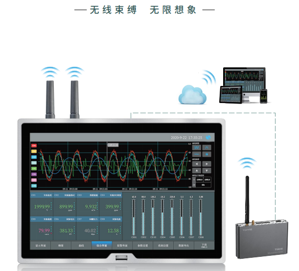 TP1100 無線數(shù)據(jù)記錄儀采用 10 英寸觸屏高清顯示,數(shù)字圖、曲線圖、柱狀圖、報警圖、歷 史