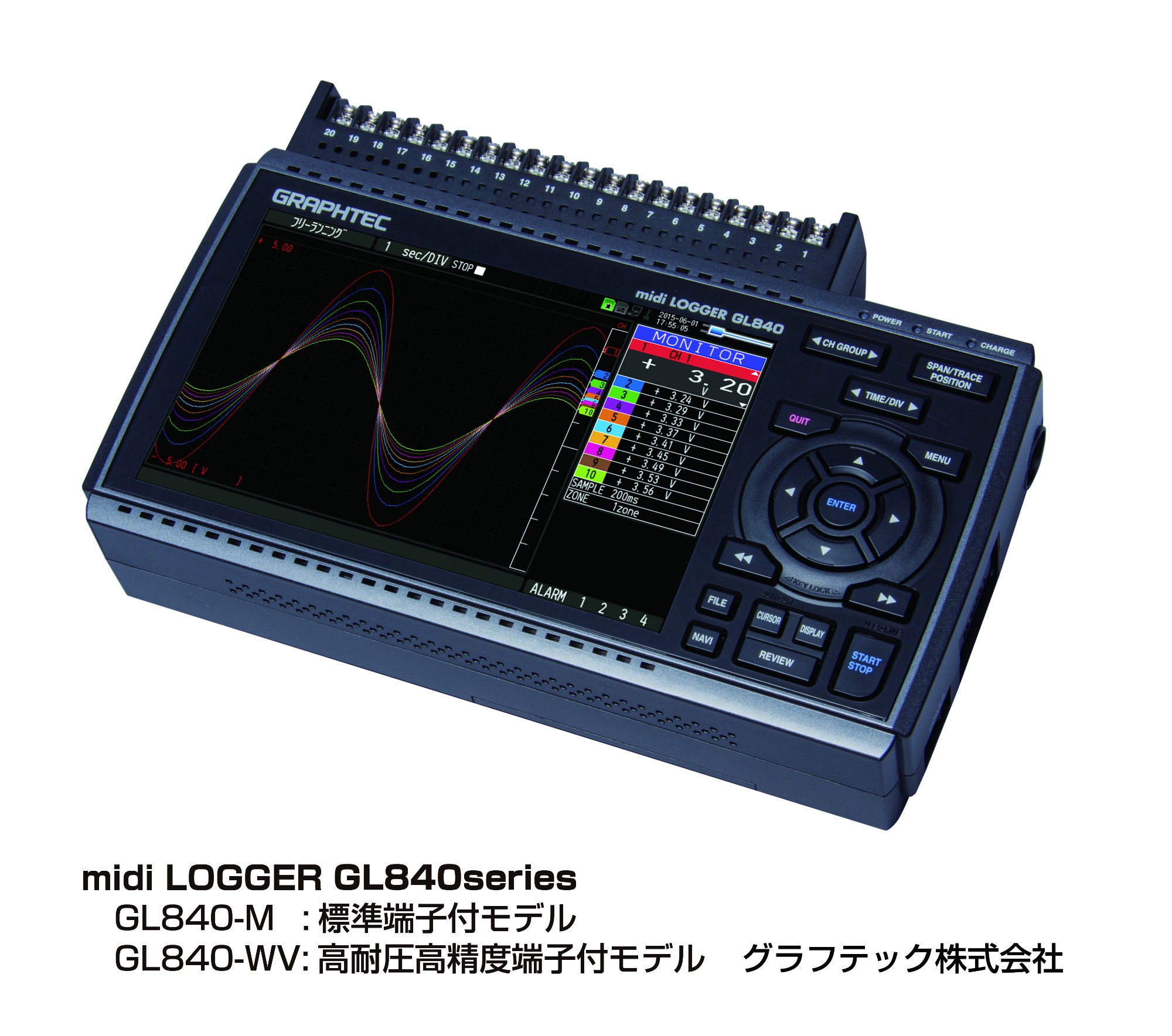 日本圖技GL840系列存儲記錄儀分為兩個型號,GL840-M是標準型配的是B564的測試端子臺,GL840-WV是高耐壓高精度型配的B565的測試端子臺、供不同測量用途選擇使用。